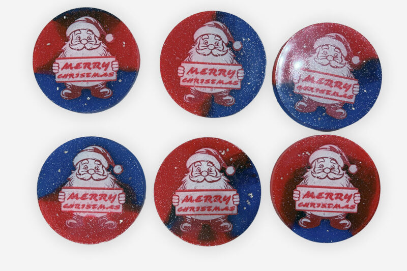 Handgefertigte Weihnachtsuntersetzer aus Epoxidharz mit weihnachtlichem Motiv.