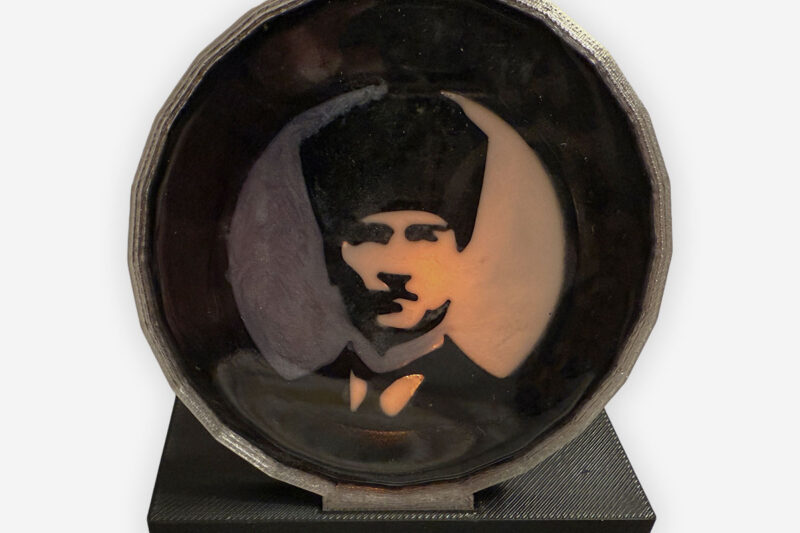 Handgefertigtes Tischornament mit Atatürk-Silhouette aus Epoxidharz und 3D-Druck.