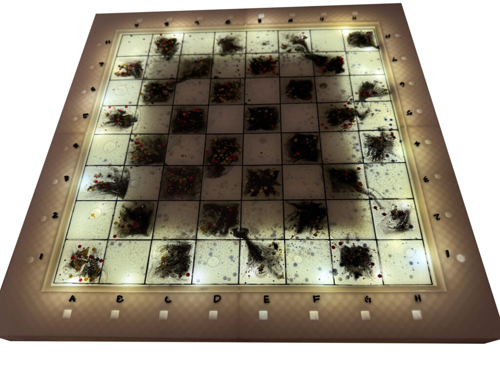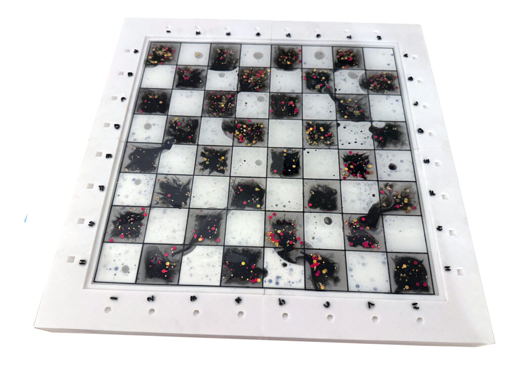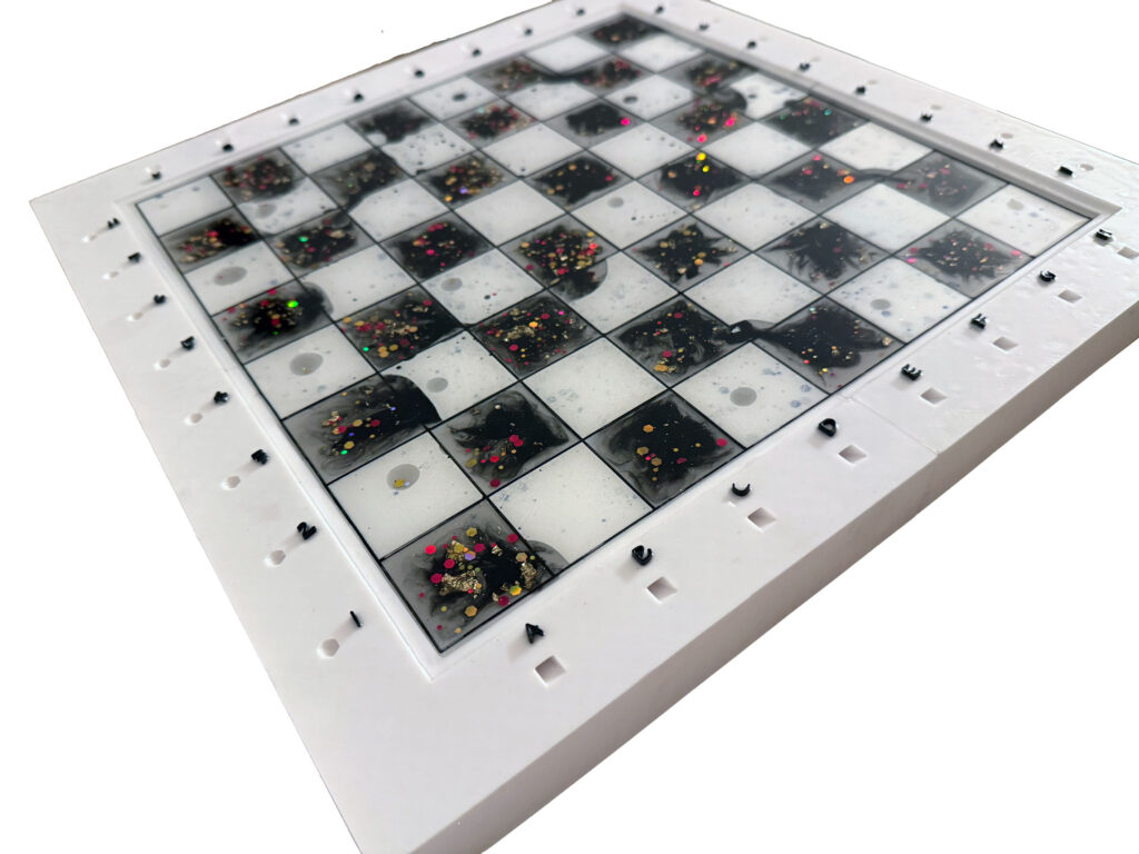 Die Mitte ist aus Epoxidharz gegossen. Es besteht aus schwarzen und weißen Quadraten, die jedoch mit verschiedenen Farbspielen und Glitzer angereichert sind. Das Spiel ist komplett handgefertigt. Für das Epoxidharz wurden die in Deutschland hergestellten Dipon- und Dipoxy-Produkte verwendet. Sie sind absolut sicher und unbedenklich.