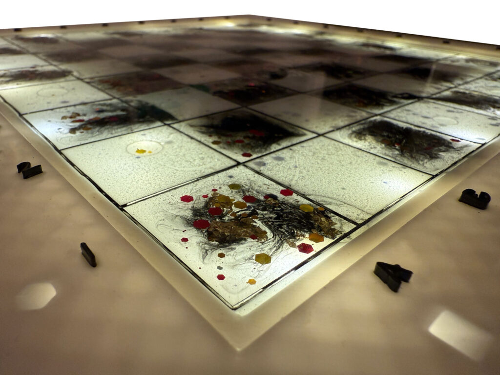 Die Geschichte dieses Schachbretts begann eines Abends in unserem Garten, als wir mit schwarzer Farbe und Glitzer spielten.