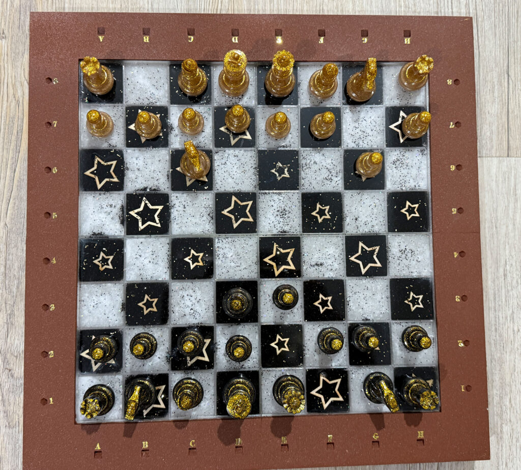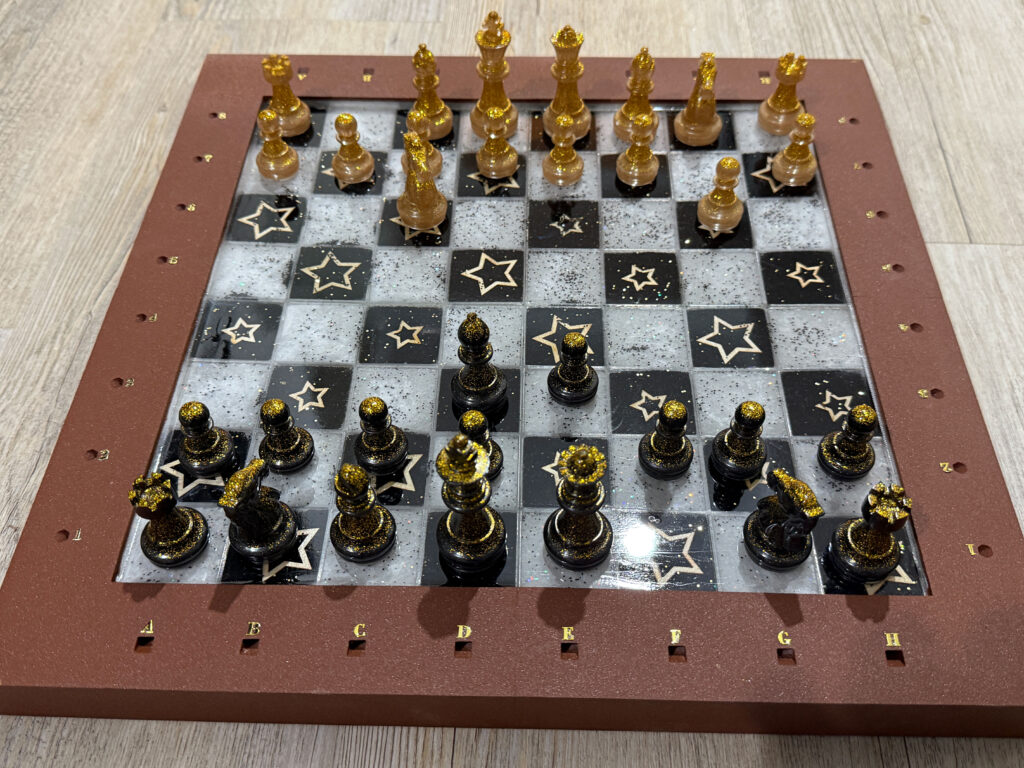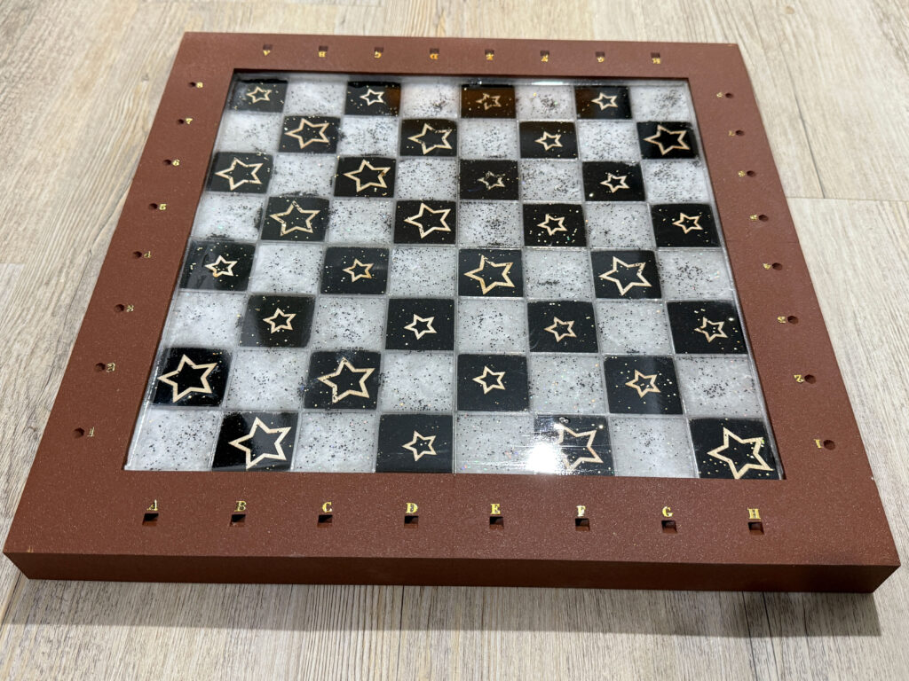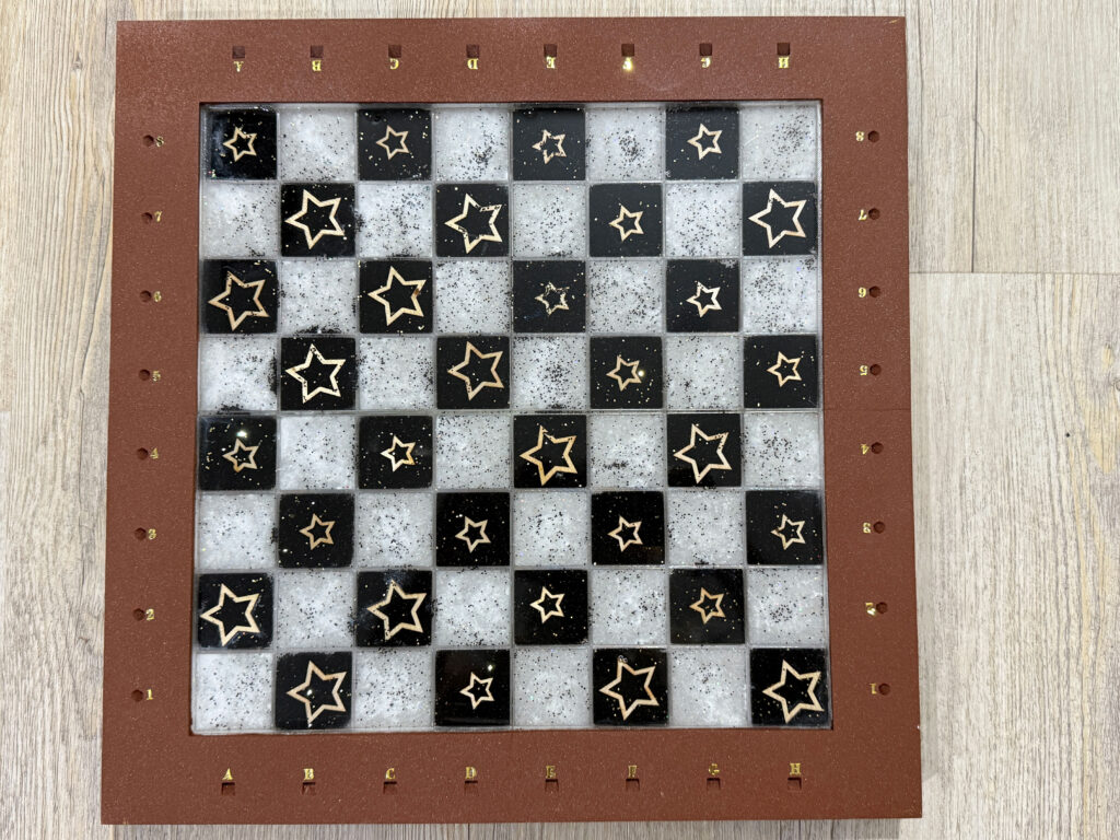 Die Mitte ist aus Epoxidharz gegossen. Sie besteht aus schwarzen und weißen Quadraten, die mit verschiedenen Farbkombinationen, Glitzer und Steinen verziert sind. Die schwarzen Quadrate sind mit Sternmotiven versehen. Das Spiel ist komplett handgefertigt. Für das Epoxidharz wurden die in Deutschland hergestellten Dipon- und Dipoxy-Produkte verwendet. Sie sind absolut sicher und unbedenklich.