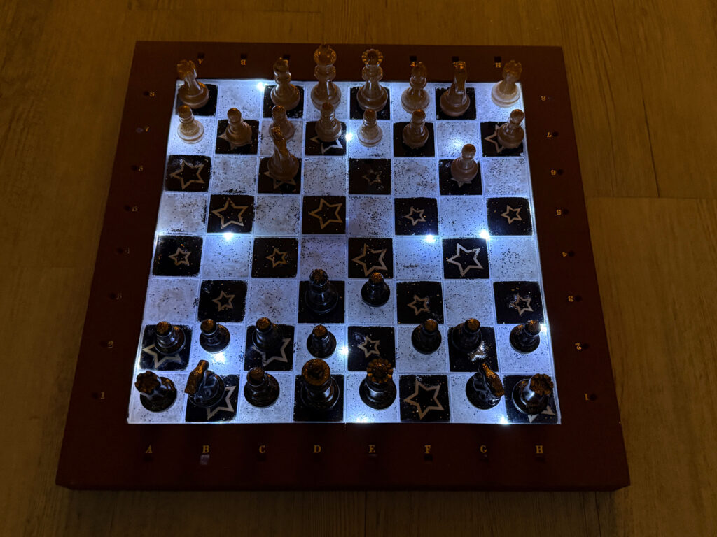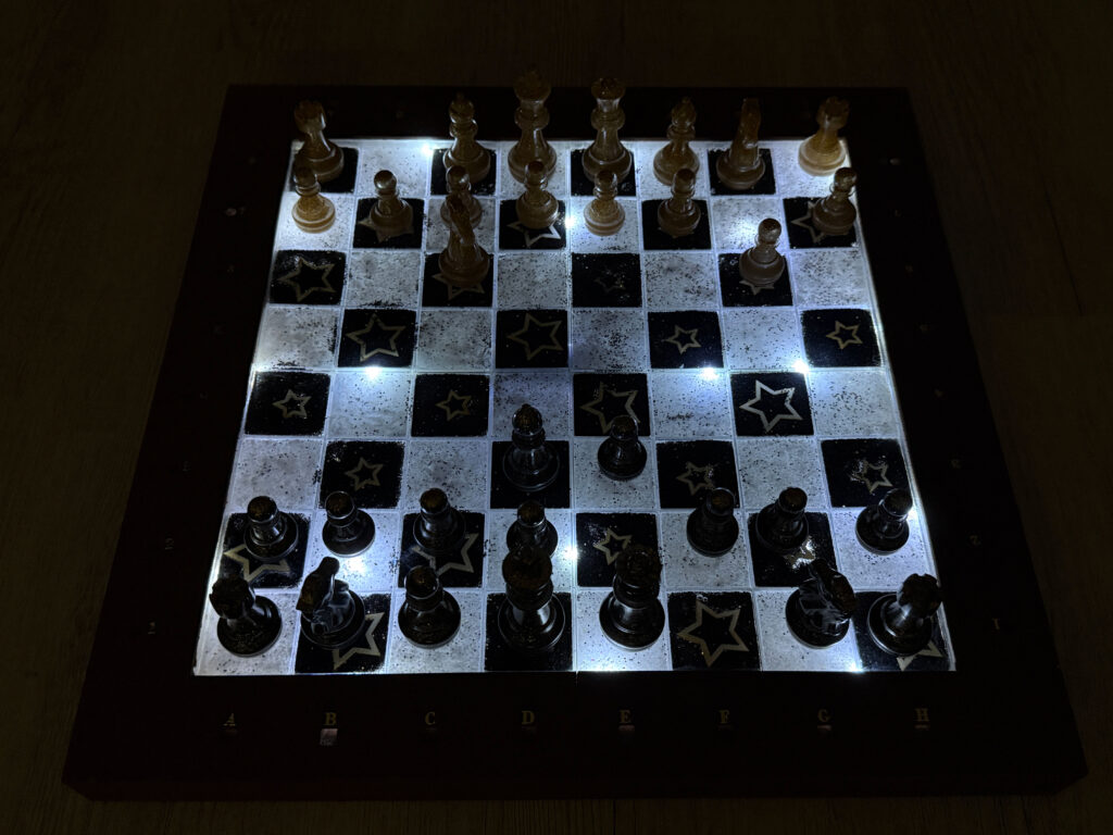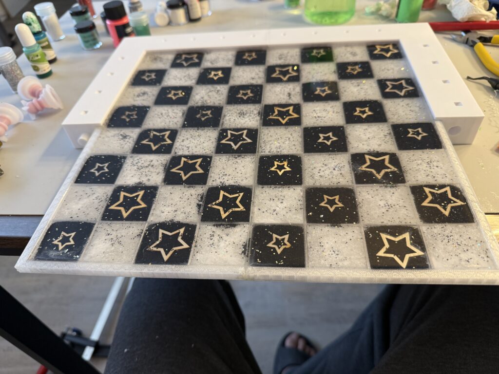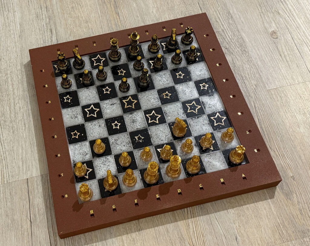 Die Mitte ist aus Epoxidharz gegossen. Sie besteht aus schwarzen und weißen Quadraten, die mit verschiedenen Farbkombinationen, Glitzer und Steinen verziert sind. Die schwarzen Quadrate sind mit Sternmotiven versehen. Das Spiel ist komplett handgefertigt. Für das Epoxidharz wurden die in Deutschland hergestellten Dipon- und Dipoxy-Produkte verwendet. Sie sind absolut sicher und unbedenklich.