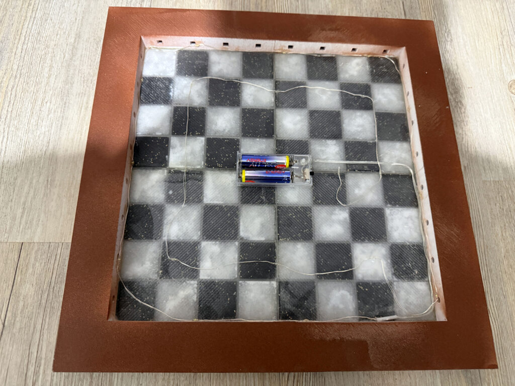Im Gegensatz zu unseren anderen Schachbrettern ist dies das erste, das wir ohne vorgefertigte Silikonformen hergestellt haben. Epoxidharz wurde direkt auf das Schachbrett gegossen, das wir anhand eines 3D-Modells entworfen hatten. Anschließend wurde es mit einem Rahmen zusammengefügt. Der Rahmen wurde gründlich mit einem 80-120-240-400er-Raster geschliffen. Anschließend wurden zwei Schichten weiße Grundierung, vier Schichten Kupferfarbe und zwei Schichten Lack aufgetragen. Jeder Schritt wurde zusätzlich mit einem gelben 800-1000-1500er-Raster geschliffen.