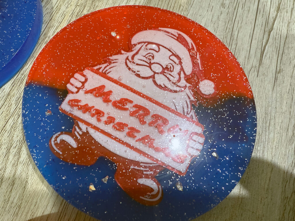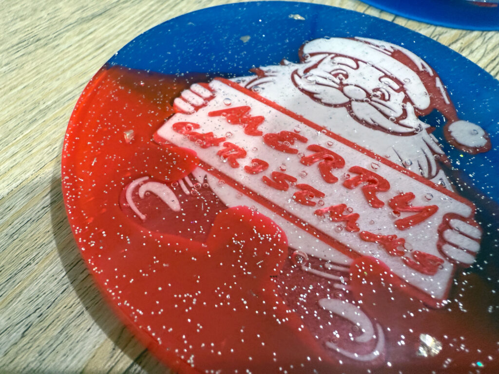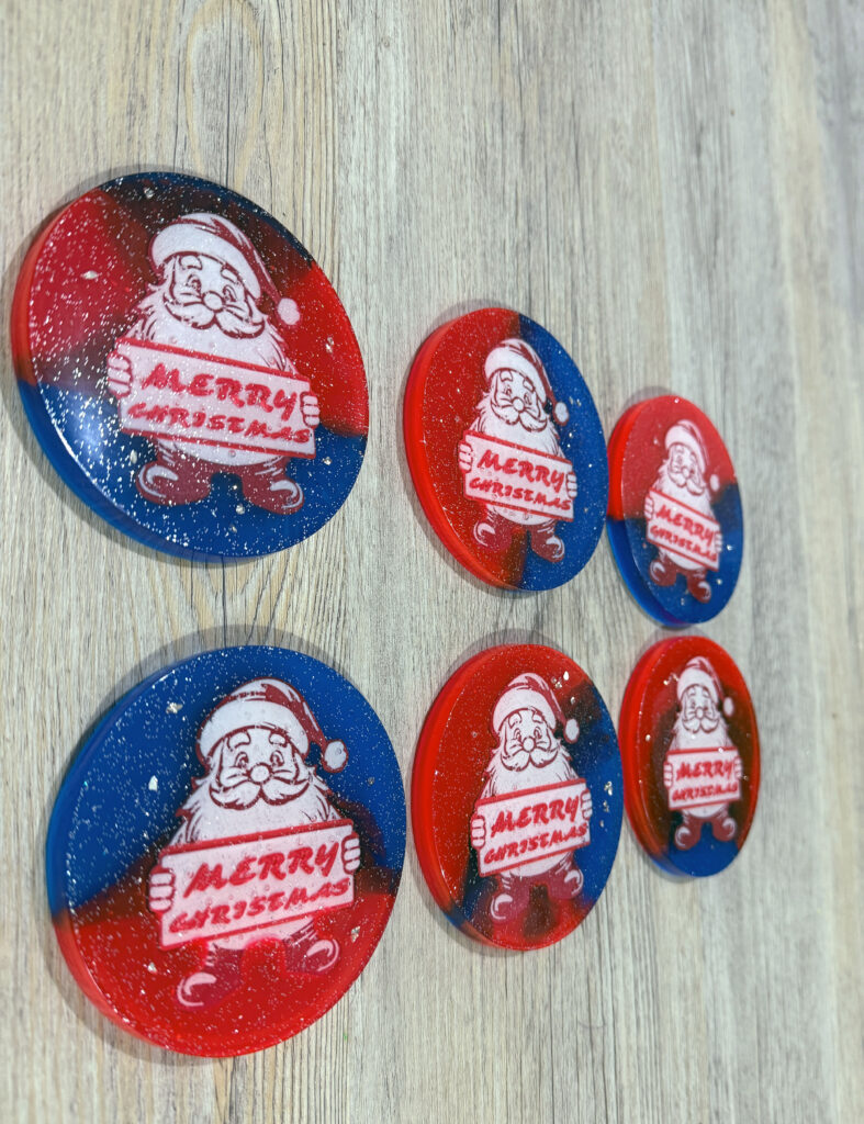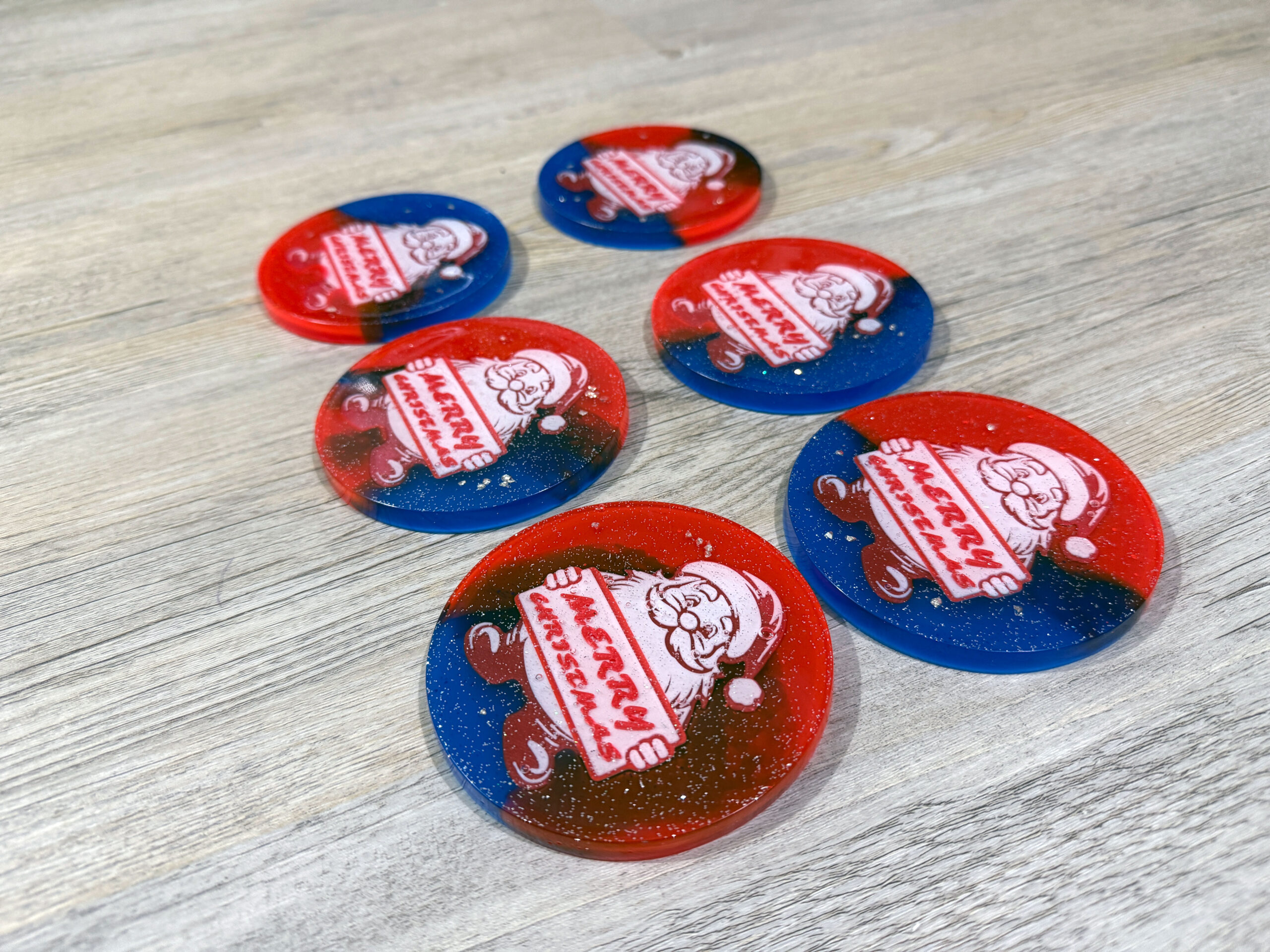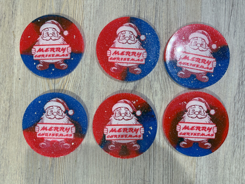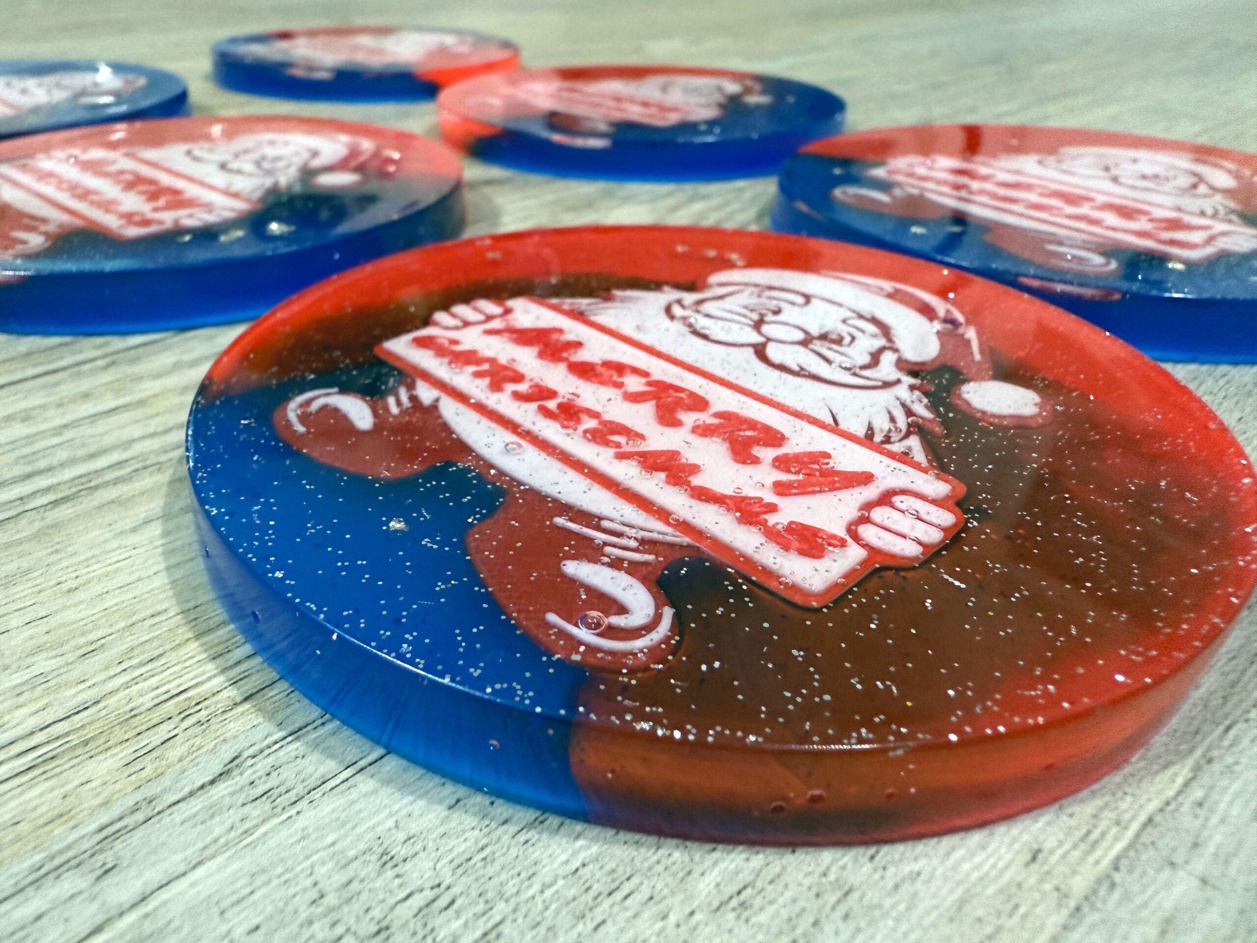 Entirely handmade Christmas coasters. Six coasters, each 10 cm in diameter, decorated with epoxy resin and 3D printed figures.