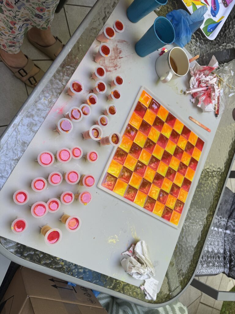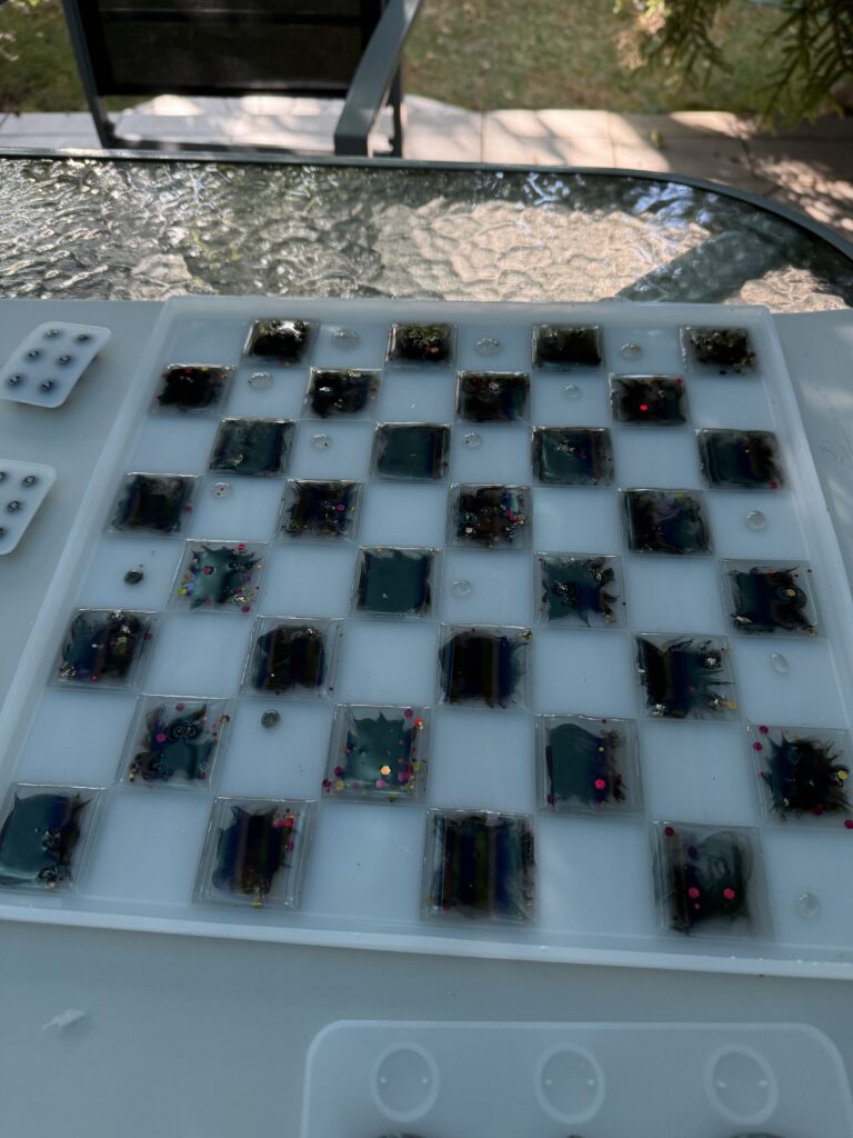 Then, we move on to the other half of the squares. We prepare our epoxy mixture, mix our paint, and begin pouring the remaining squares. Since the other squares are drying at this point, we can clean up any spills or overflows. Once the remaining squares are poured, we let them dry again for at least one day.