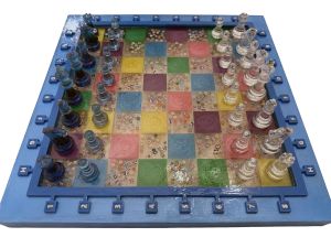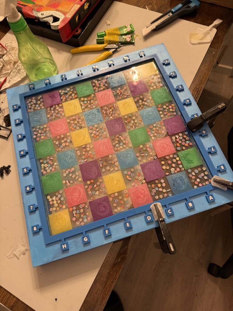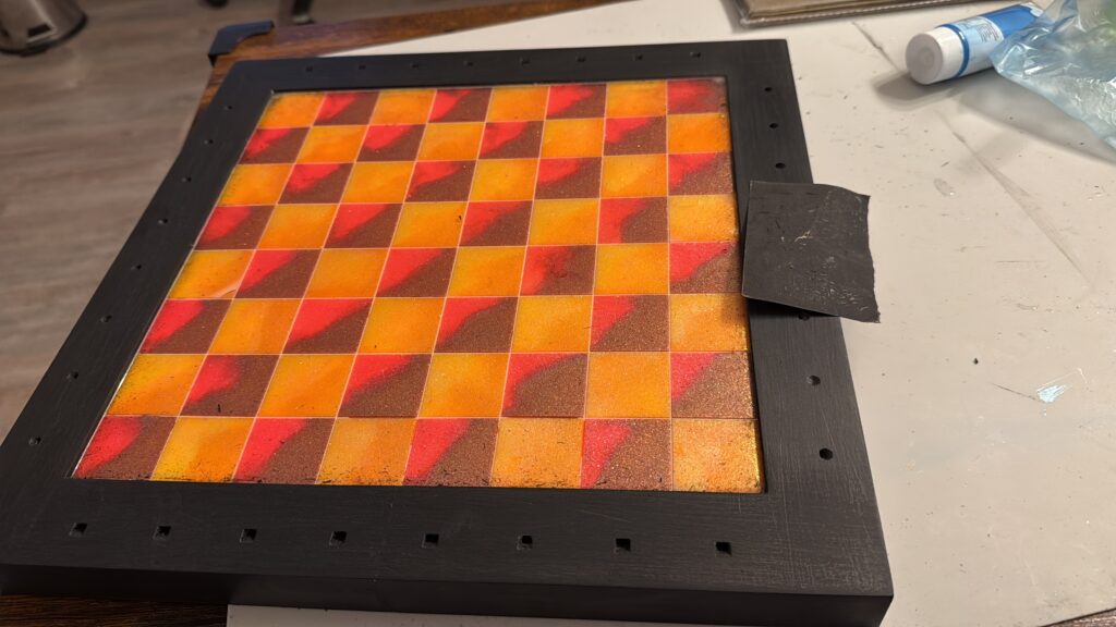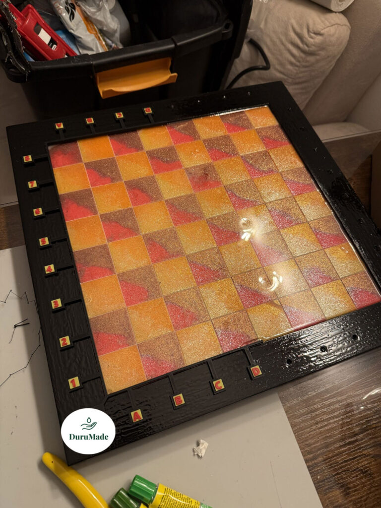 Sometimes before painting, sometimes after; sometimes a little before and a little after, we assemble the frame and chessboard. We fuse the chessboard and frame into a single piece. We generally use fast-drying epoxy adhesives for this process. We let it set for at least a day. Then, we seal all the joints of our now-solid frame with liquid latex or aquarium silicone. This is because we’ll be applying another coat of epoxy both on and under the chessboard. This will make the chessboard very durable and will eliminate any unsightly effects from painting or sanding.