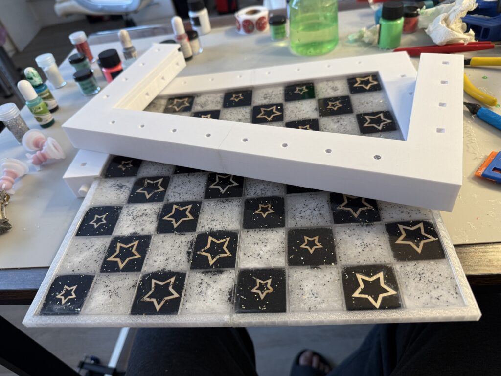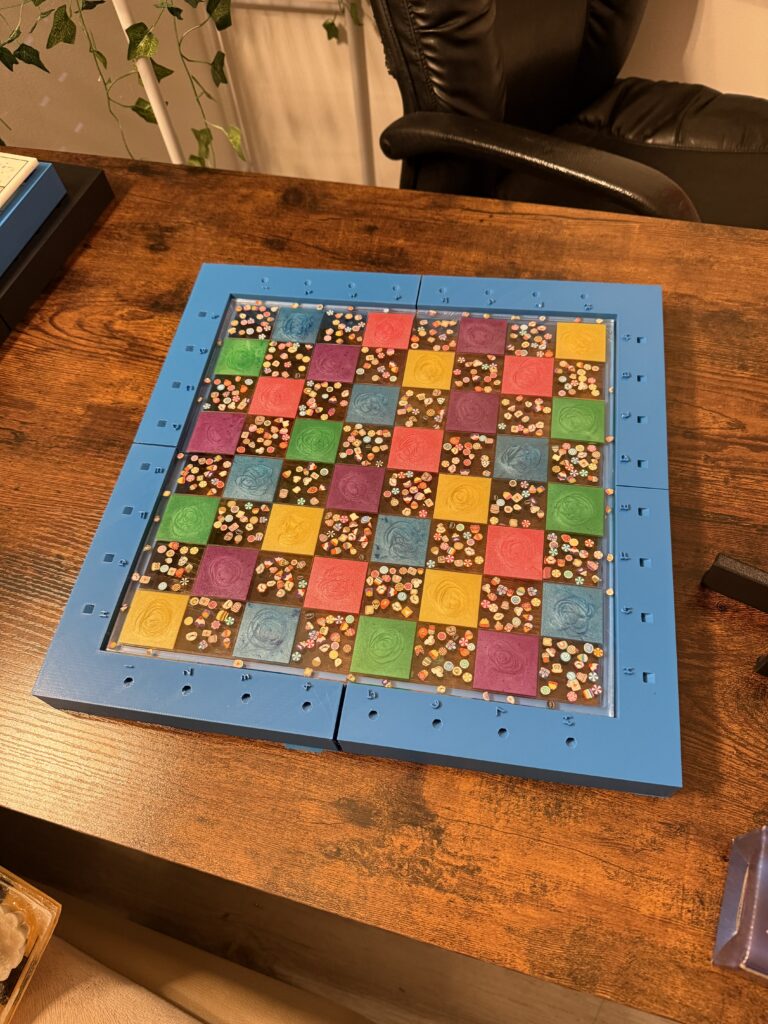 Here, I’ll tell you the story of how we make a standard 30×30 cm chessboard, with the center cast in a silicone mold and the frame printed on a 3D printer. Examples of this type include: