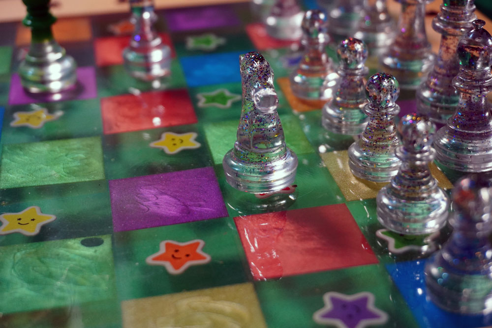 The center is cast from epoxy resin. It consists of colorful and transparent squares, enriched with various color combinations, glitter, and stones. The transparent squares feature star motifs. The game is entirely handmade. German-made Dipon and Dipoxy products were used for the epoxy resin. They are completely safe and harmless.