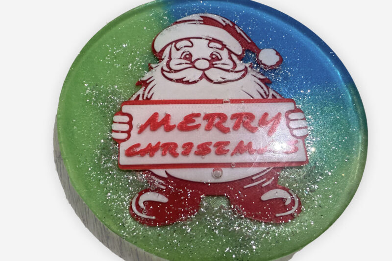Handgefertigte Weihnachtsuntersetzer aus Epoxidharz mit dekorativem Motiv.