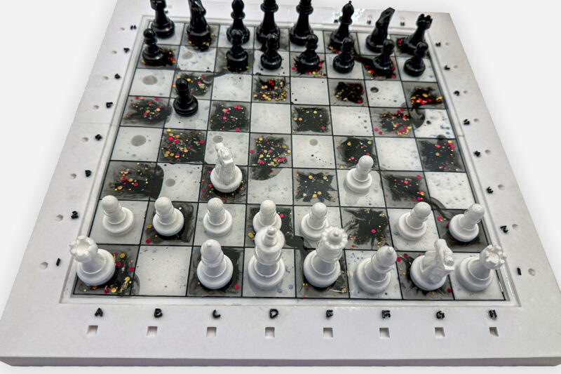 Handgefertigtes Schachspiel aus Epoxidharz in klassischem Schwarz-Weiß-Design.